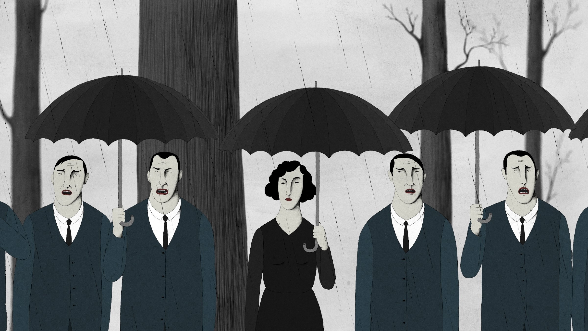 W dniu pogrzebu męża Eevy nad miastem zalega deszczowa aura. Tragedię dopełnia niespodziewana śmierć dzięcioła, który miał dostarczyć ważną, zakodowaną wiadomość. Wśród żałobników pojawia się dużo łez i jeszcze więcej wina, a granica między rzeczywistością a snem się zaciera.